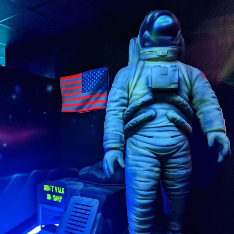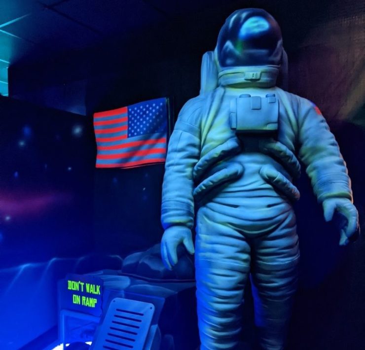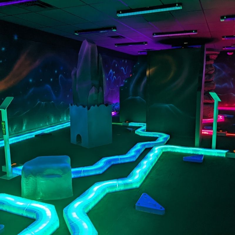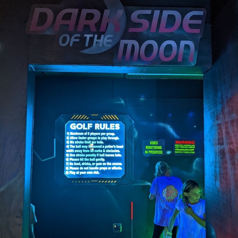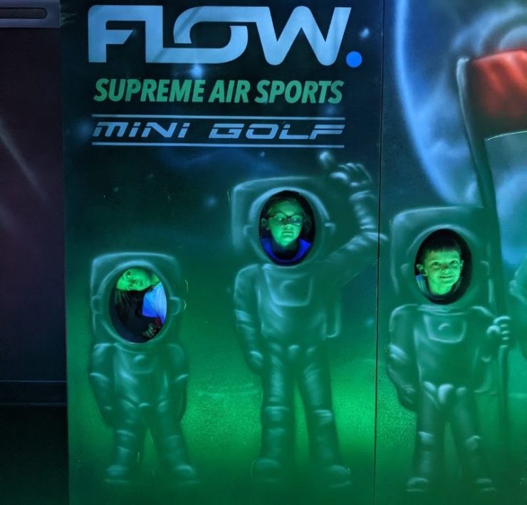 I’m no longer someone who jumps on trampolines a lot, so having a different activity option was great, and mini golf is always fun. But, mini golf surrounded by black lights, aliens and spaceships was pretty cool. Everyone can choose a glow-in-the-dark ball and putter and choose one of two six-hole courses. There’s an alien course or a rocket course. Guests can either buy one six-hole course or a 12-hole course and play on both courses or repeat one.