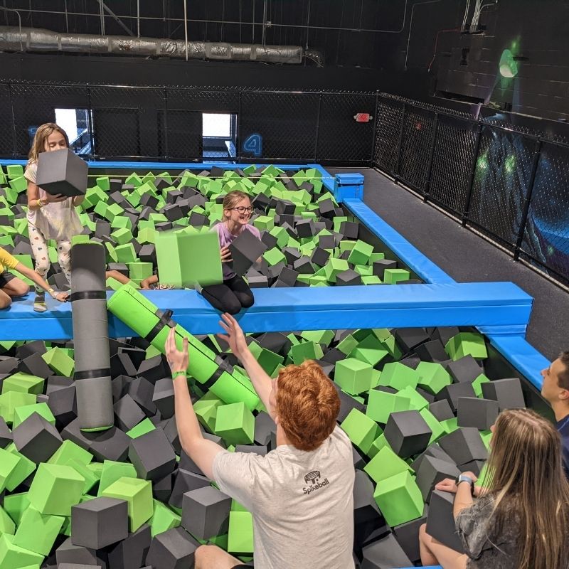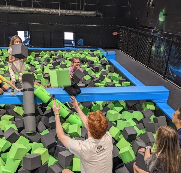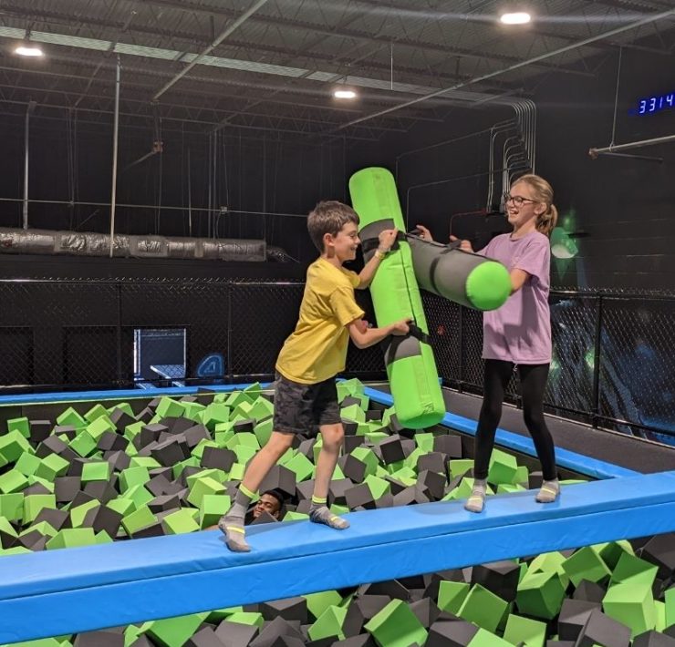 Flow has many of the same trampoline activities as other similar parks, but it also bring new games into the mix. Our group spent a lot of time hanging on the trapeze and landing on the giant pillow mat, and then heading to the neighboring jousting equipment to knock each other off the beam. At one point our group of three elementary-aged kids teamed up against some high school kids and had a blast. Next to this area is a tightrope that proved trickier than it looked. The line is just over an inch wide, but you need to move fast to get across without falling in the foam pit.