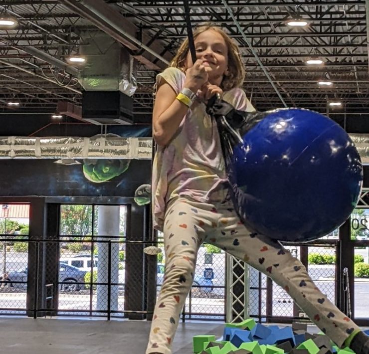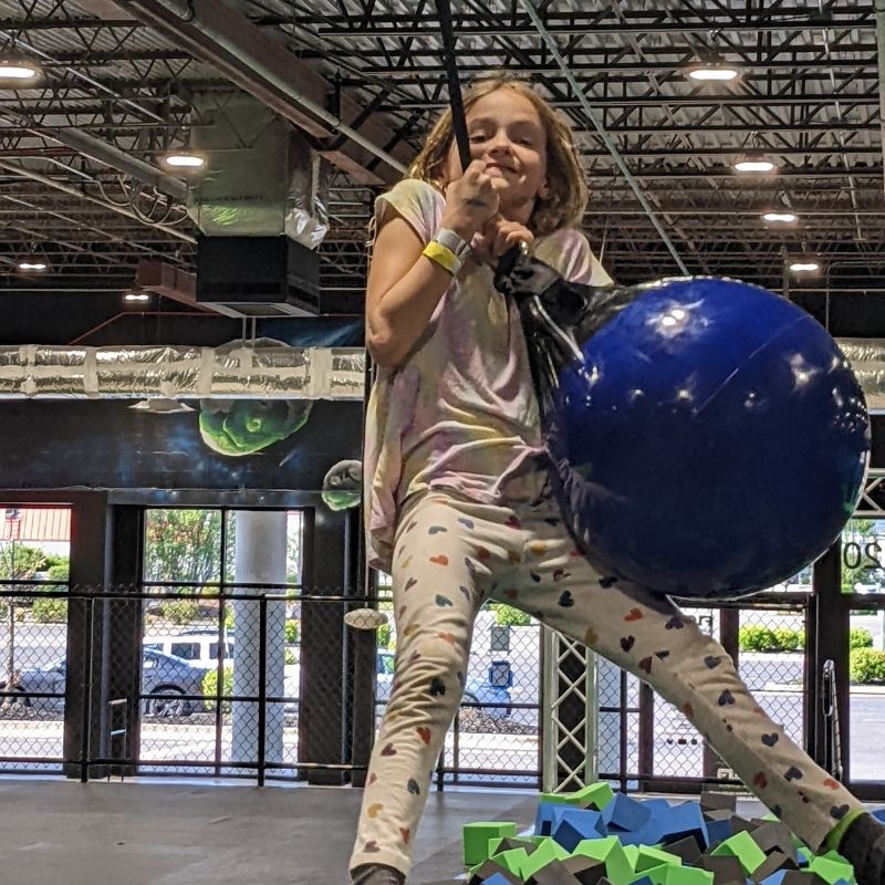 The zip-line is more of a ball hanging from a rope and you have to decide if you want to try and hang from the rope or try and jump up onto the ball and ride. The kids tried riding it in all different ways, but had the most success jumping on the ball; however, they also liked hanging on the rope because they landed in the foam pit sooner. The zip-line isn’t fast and has a soft landing.