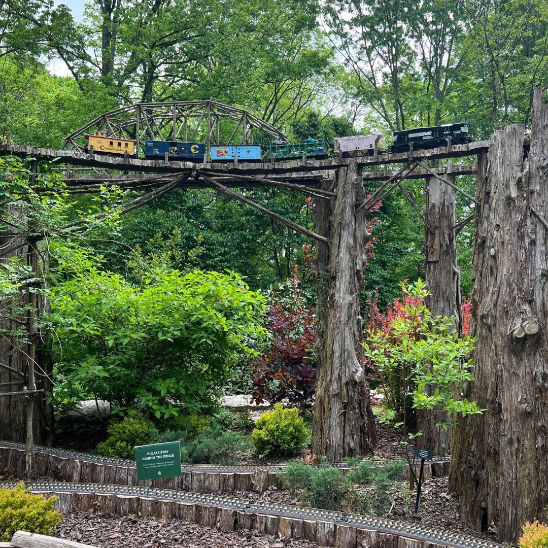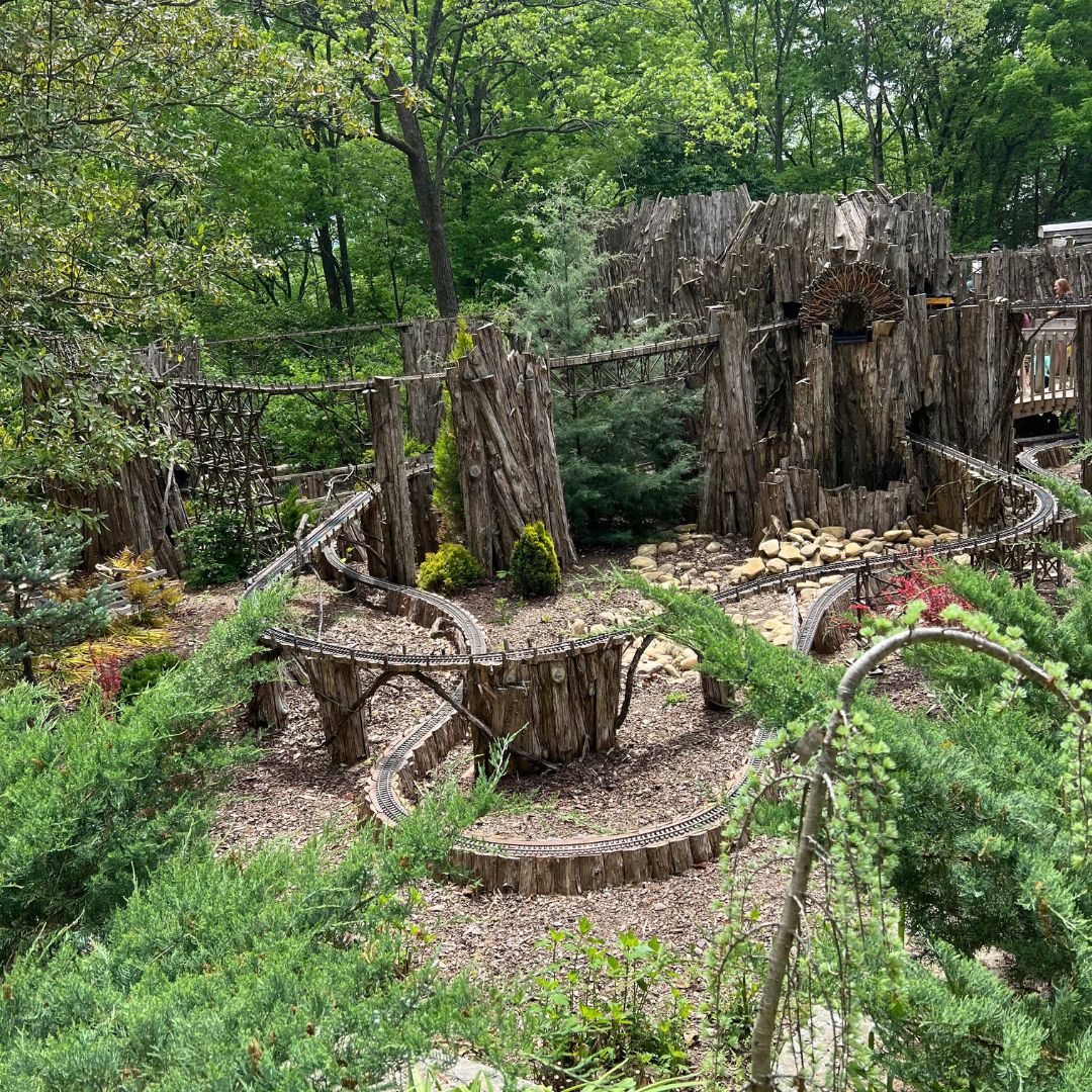 We actually initially walked past this area and had to come back later, but I am so glad we didn’t miss it. If you have a little train lover, they’ll be in their happy place here. The garden features a toy train structure for play as well as an absolutely stunning model train that circles over the play area.