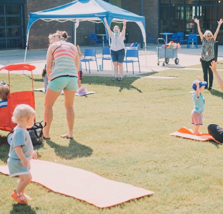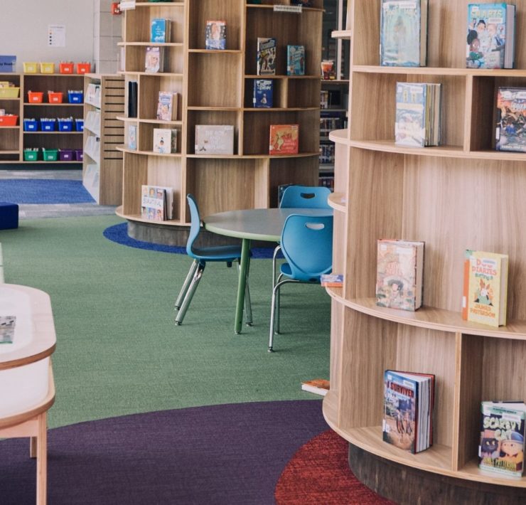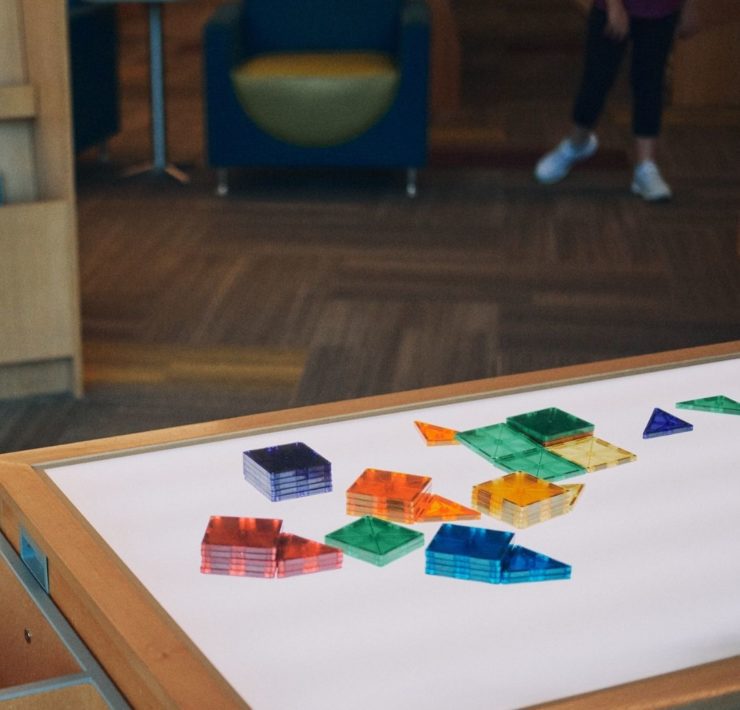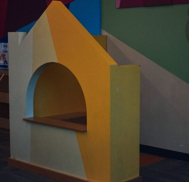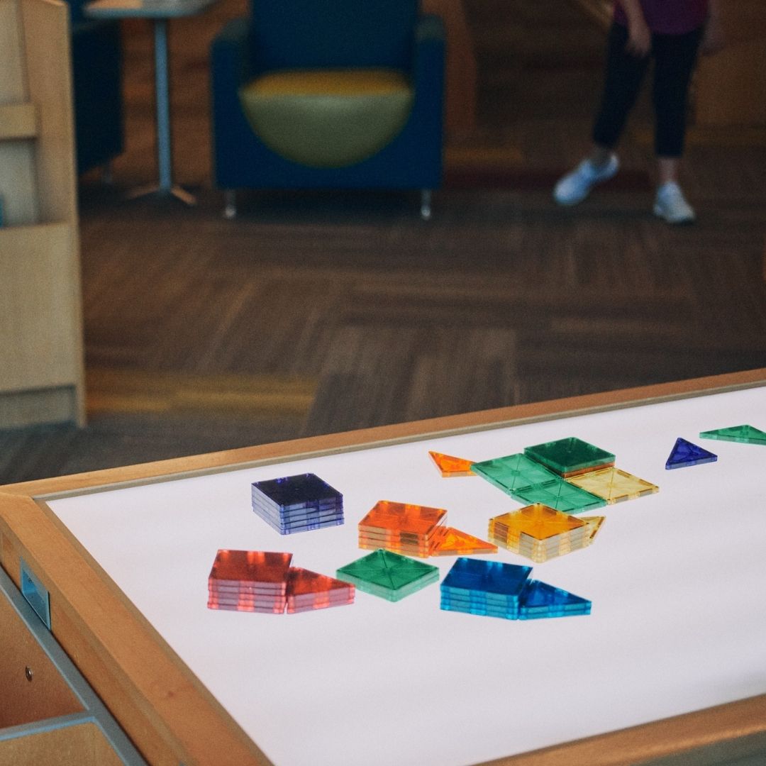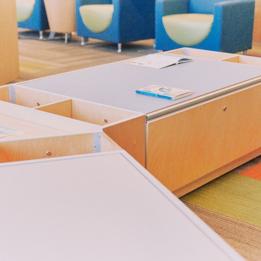 The North Huntsville library uses their community room for story time to allow for adequate spacing. The max capacity of their community room is 150, so there is plenty of space to spread out. The children’s section has an activity table with magnetic tiles, soft blocks for fort building, benches for reading, and shelves with easy access for little hands. There is also a playground with a covered picnic area outside.