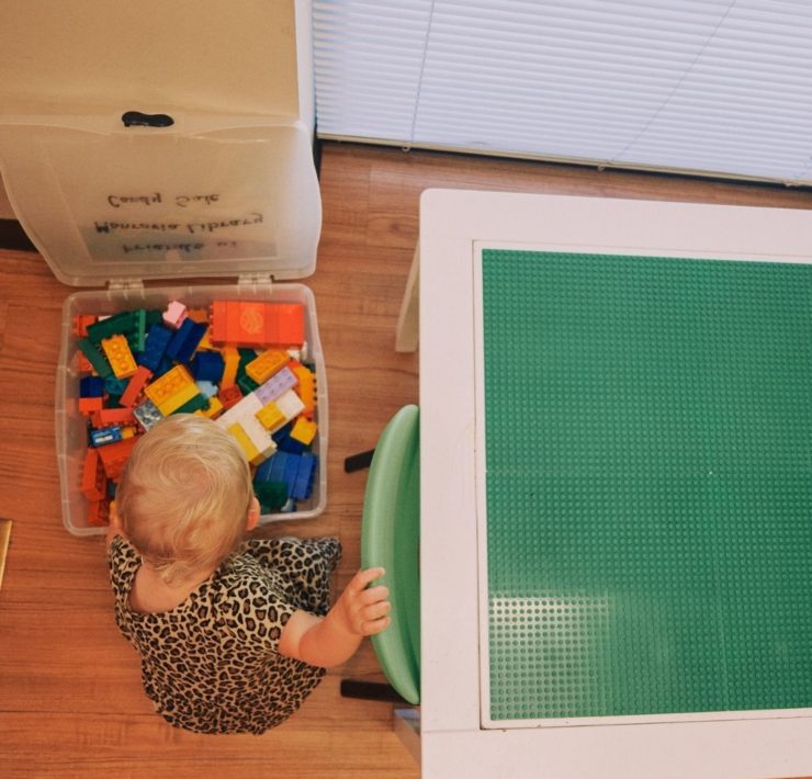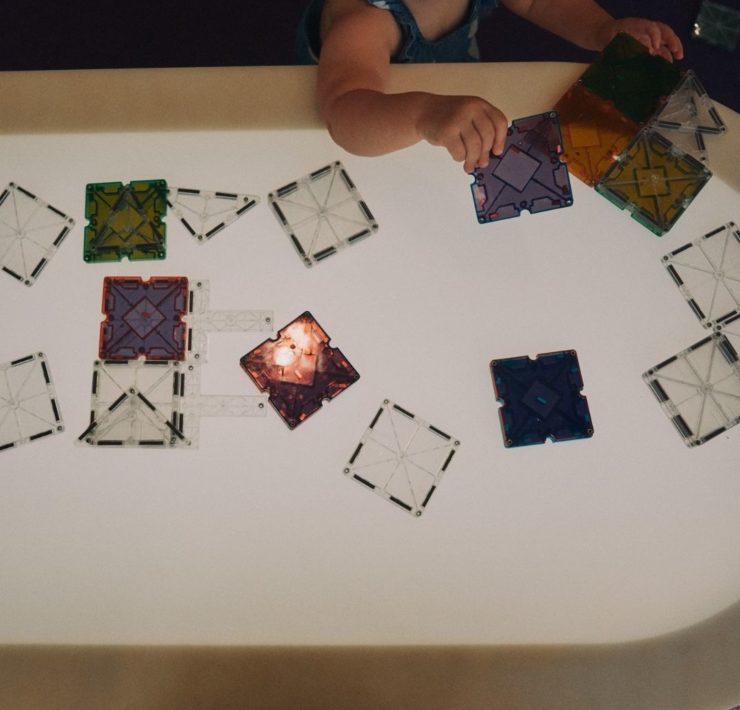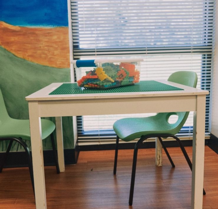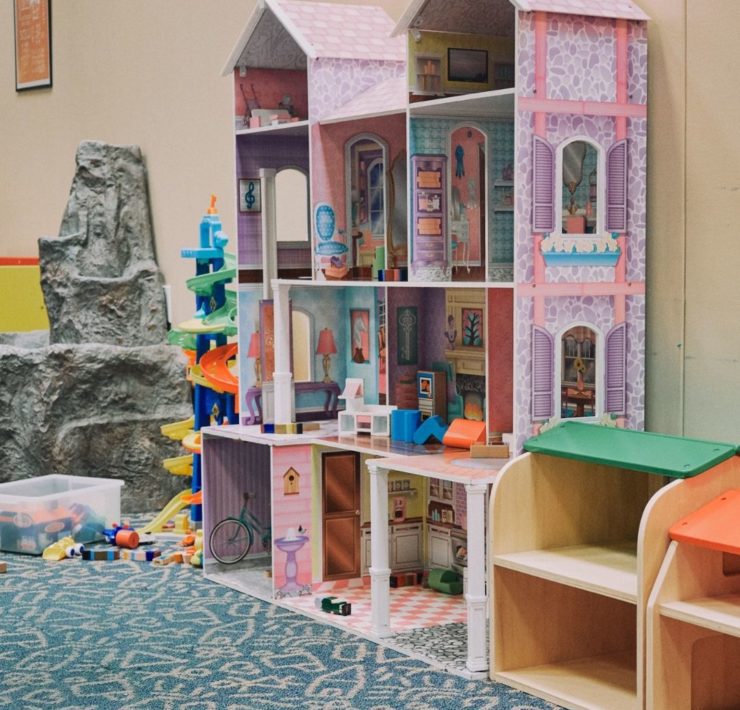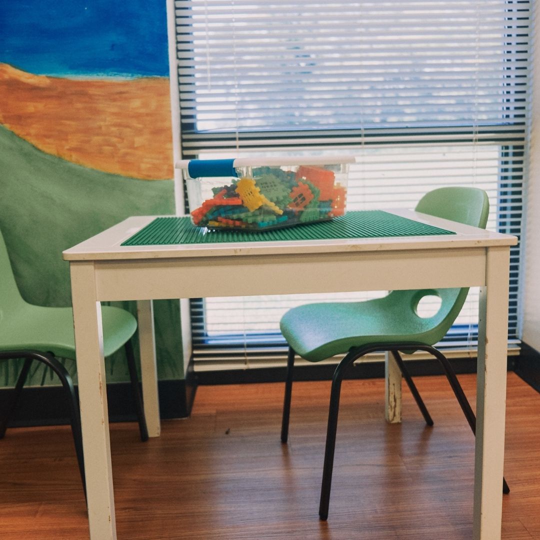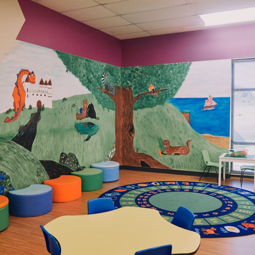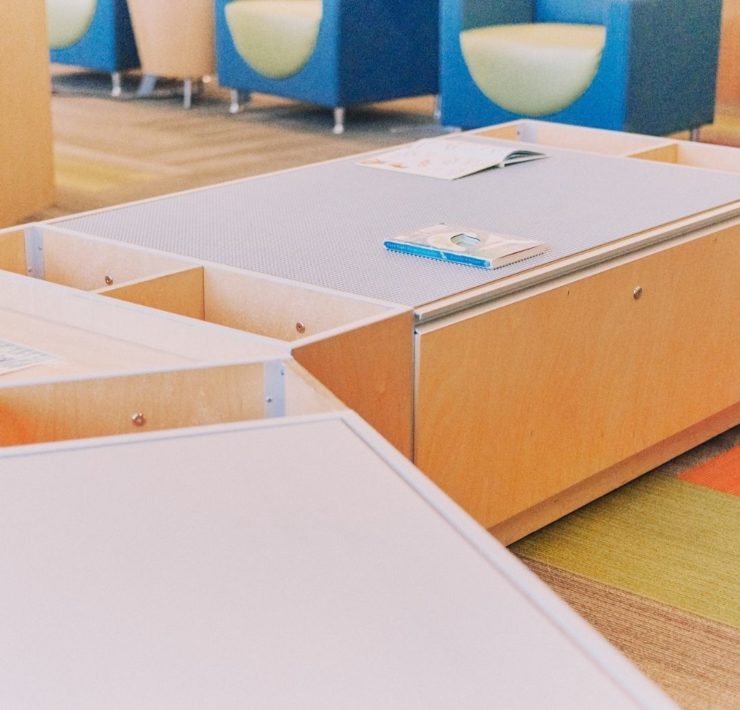 The North Huntsville library uses their community room for story time to allow for adequate spacing. The max capacity of their community room is 150, so there is plenty of space to spread out. The children’s section has an activity table with magnetic tiles, soft blocks for fort building, benches for reading, and shelves with easy access for little hands. There is also a playground with a covered picnic area outside.