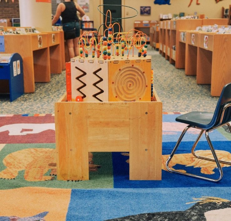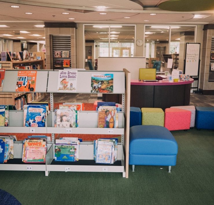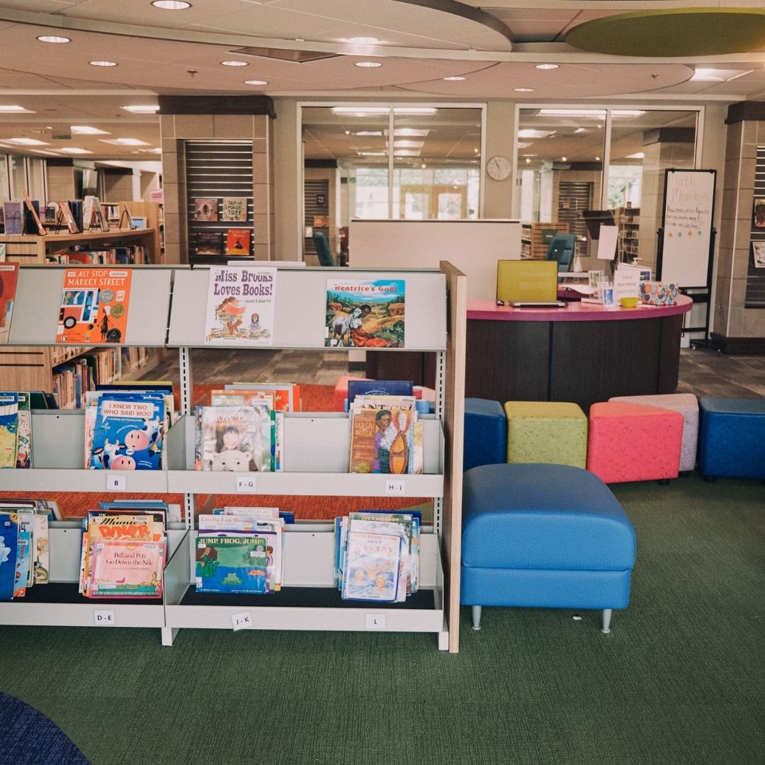 The Madison Library has activity tables with magnetic tiles, bins for books (easy access for little ones), picnic tables outside the children’s section, computers, a play house, and little tables and chairs. Story time at Madison is usually outside, with mats for proper spacing.