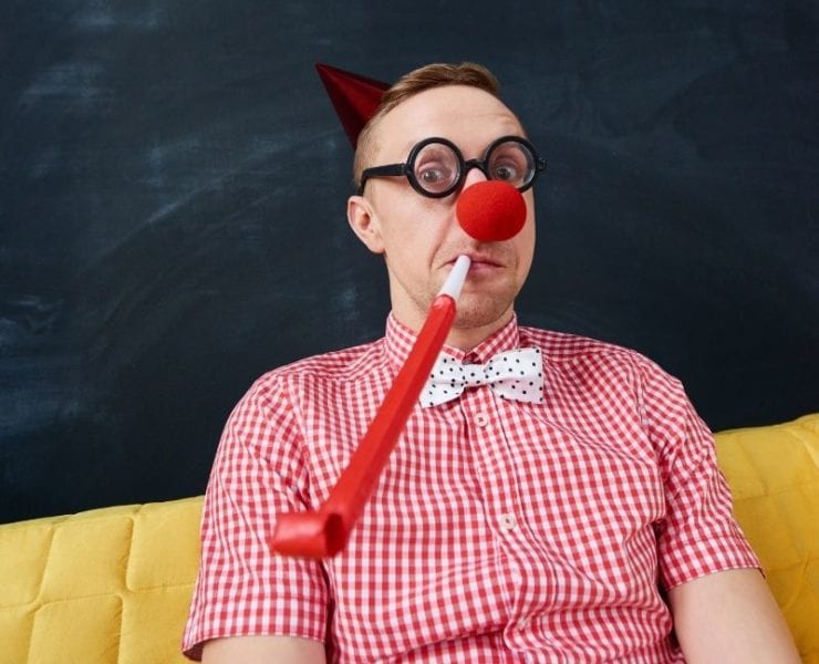 A young boy holds a paper beard and wears green as part of Saint Patrick's Day.