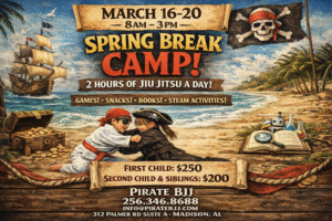 Pirate BJJ Spring Break Camp is the perfect mix of movement, learning, and adventure for kids who need to burn energy and have a blast while school is out. Each day, campers will dive into Brazilian Jiu-Jitsu instruction designed for kids, along with games, STEAM activities, reading time, and plenty of pirate-themed fun.