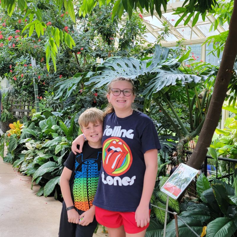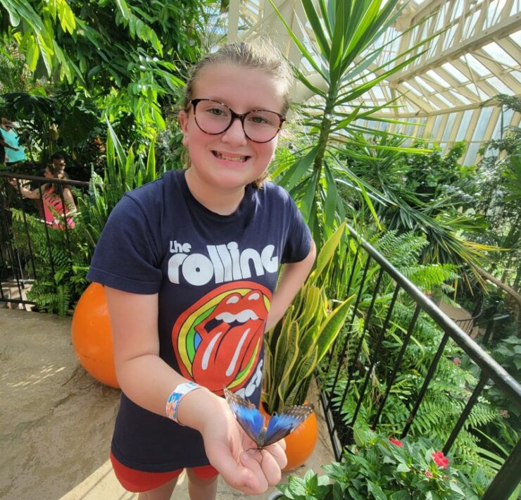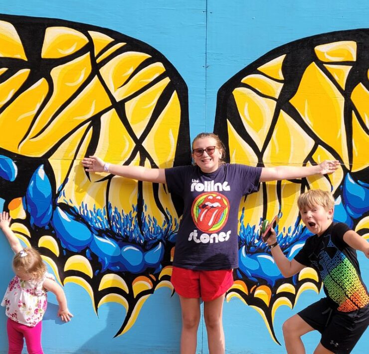 Three children of varying ages pose in front of a yellow and blue butterfly mural at Callaway Gardens.