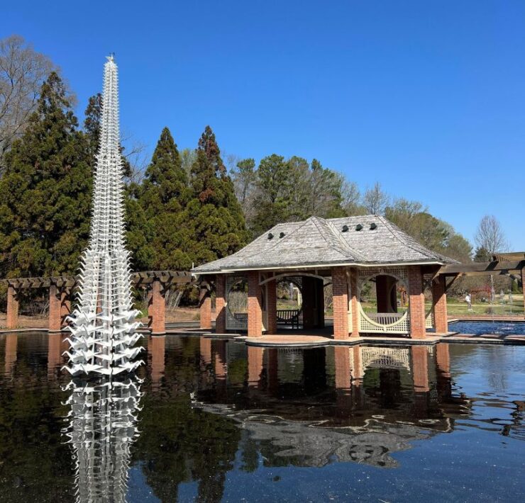 You won’t want to miss the highlight of Origami in the Garden, “Master Peace” where hundreds of origami peace cranes form a 25-foot-tall tower over the Aquatic Garden! Coupled with the flow of the water, this one is a great place to stop and reflect.