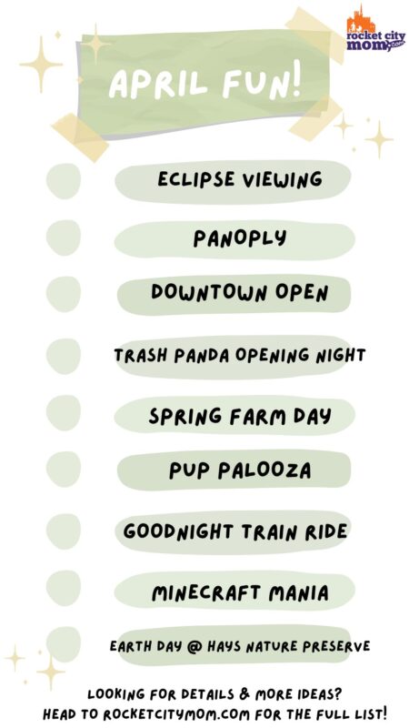 Spring has sprung and the Rocket City is blooming with special events and activities for families. With so many opportunities, events and spring festivals, it can be a bit overwhelming. Don’t worry, as always Rocket City Mom has your back!