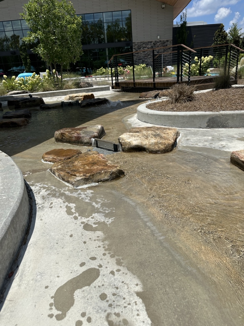 An interactive stream feature where kids can play, build dams, and reroute the water