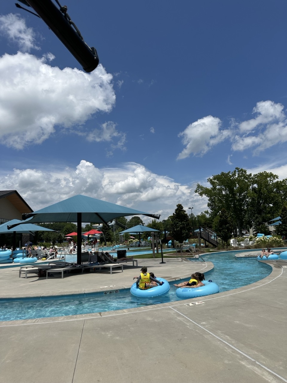 A lazy river over 600 feet long, complete with waterfall and shallow pool areas