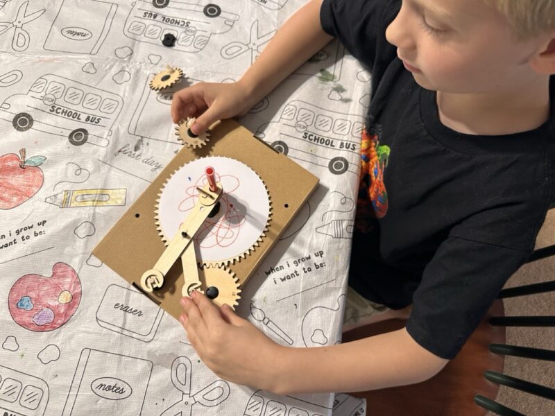 Every piece was clearly labeled, and we didn’t have to scramble for any extra supplies, a HUGE plus when you have a super-excited kiddo who is ready to work on the projects as soon as the box is delivered. There was also a sheet of fun stickers that related to the activity theme. Our kiddo used some of them to decorate the cycloid drawing machine when he finished it. (and he even let us keep a couple of them so we could be as “math cool” as he is. Never thought we would be called “math cool” but it sounded like a compliment, so guess that’s a win all around.)