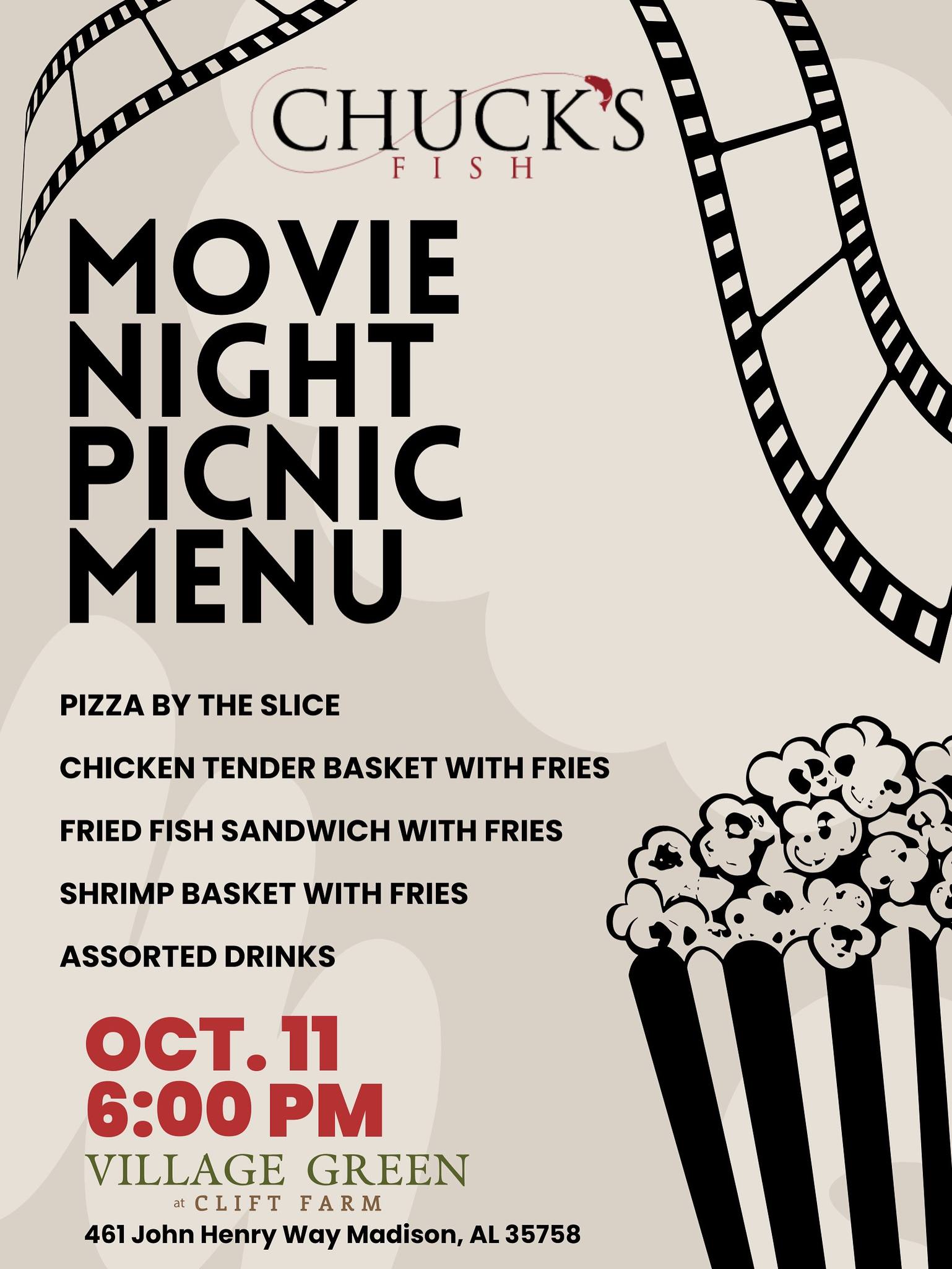 Enjoy free face painting! Chuck’s Fish will have a picnic dinner menu for movie night available for purchase, and S&J Produce will have a pumpkin patch set up.