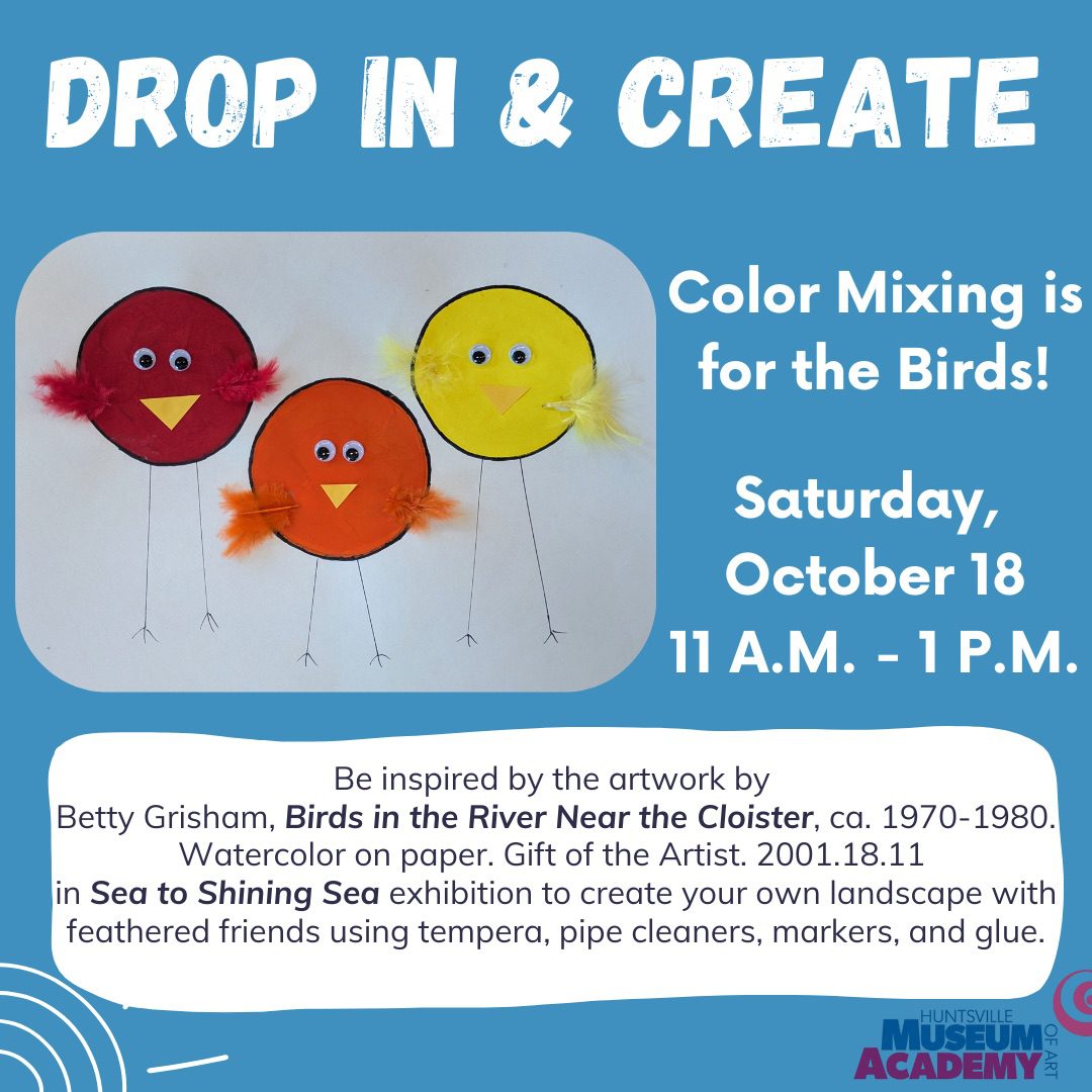 Be inspired by the artwork by Betty Grisham, Birds in the River Near the Cloister, ca. 1970-1980, watercolor on paper. Gift of the Artist. 2001.18.11 in Sea to Shining Sea exhibition to create your own landscape with feathered friends using tempera, pipe cleaners, markers, and glue.